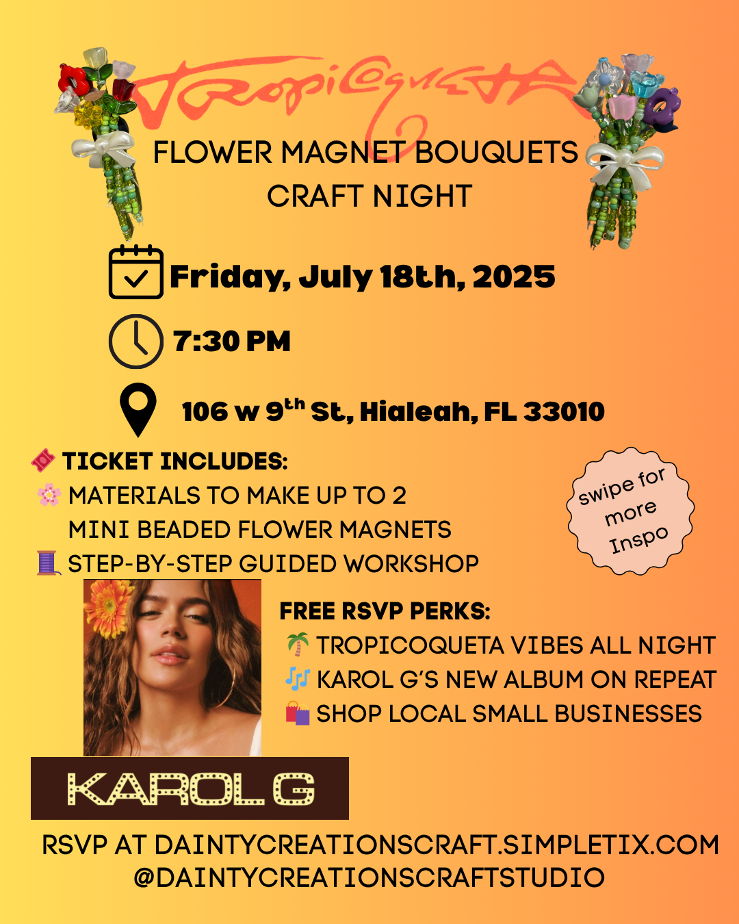 Hosted by Dainty Creations Craft Studio, LLC, join us on Friday, July 18th, 2025 at 7:30 PM at 106 W 9th St, Hialeah, FL 33010 for a creative and colorful night filled with beads, florals, and Tropicoqueta vibes 💅🌴