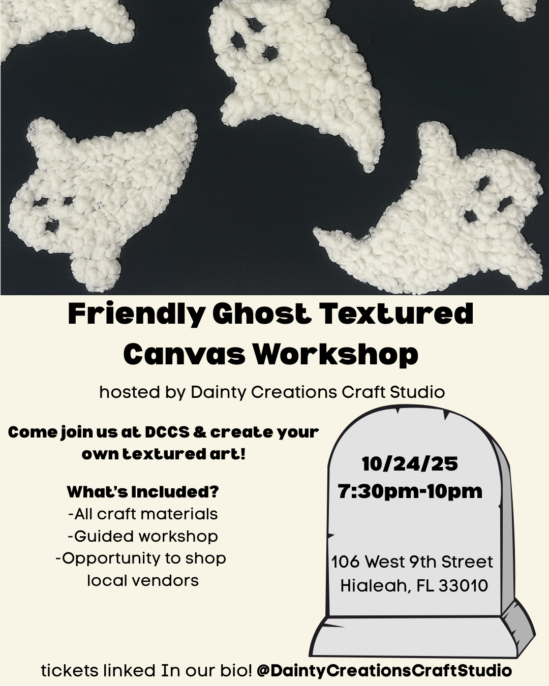 ✨ Taller de Lienzo Texturizado – Fantasma Amigable ✨¡Acompáñanos para una noche divertida y creativa en Dainty Creations Craft Studio el viernes 24 de octubre de 2025, de 7 PM – 10 PM!